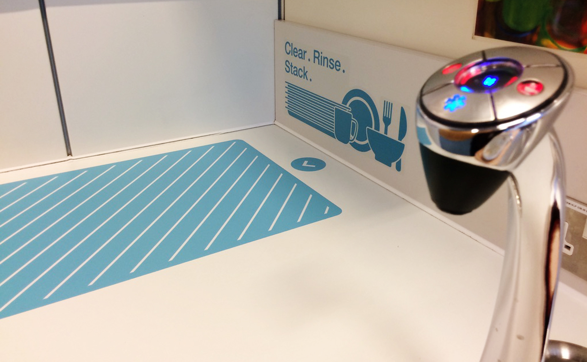 Branded graphic to highlight tray drop zone. Simple clean graphic combined with 'Clear. Rinse. Stack.' messaging provide a clear prompt.